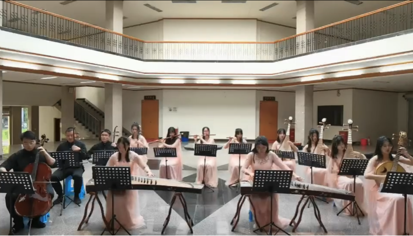 艺术团民乐队由王真珍、李文婷、李正菲、陈钰洁、俞玉洁、郑瑞婷、李璇、姚颖、卢晓薇、蔡宗成、江钰锟、林汝熙十二位成员组成,文艺教研部的黄怀宇、魏雅芳、翁佳仪、庄达宏四位老师倾情指导,共同完成民乐合奏《雨碎江南》。